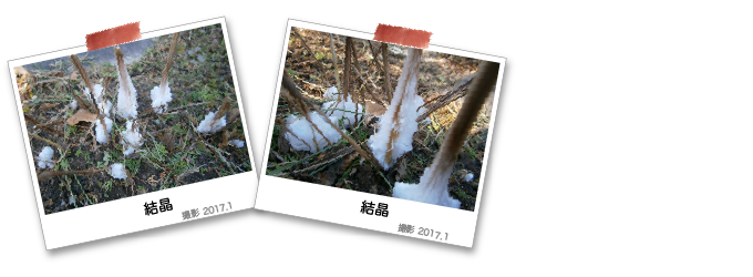 珍しい自然現象を冷え込んだ朝の庭に見つけましたので撮影しました。草の水分が冷えて結晶になったものでとてもきれいでした。