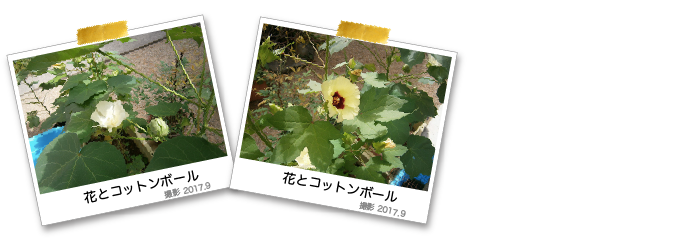 8月末頃から花が咲きはじめ、真夏の日照りバッタの大発生にも負けずに育った数本の枝に、今、コットンボールが大きく育っています。花の種類が2種類なのでたぶんコットンボールがはじけてやわらかい綿が姿をみせるのを楽しみに待っています。
